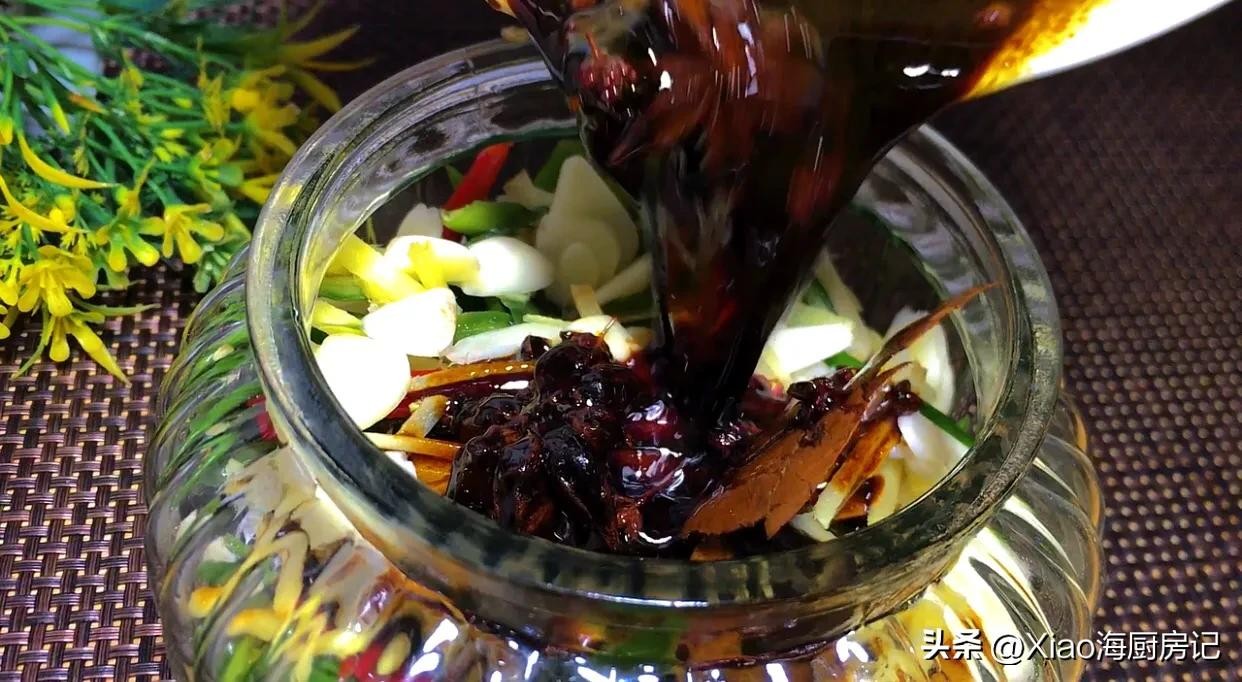 这个时候倒入黄豆酱油 ,生抽,香醋炒香 ,熬至冰糖融化 ,关火晾凉备用