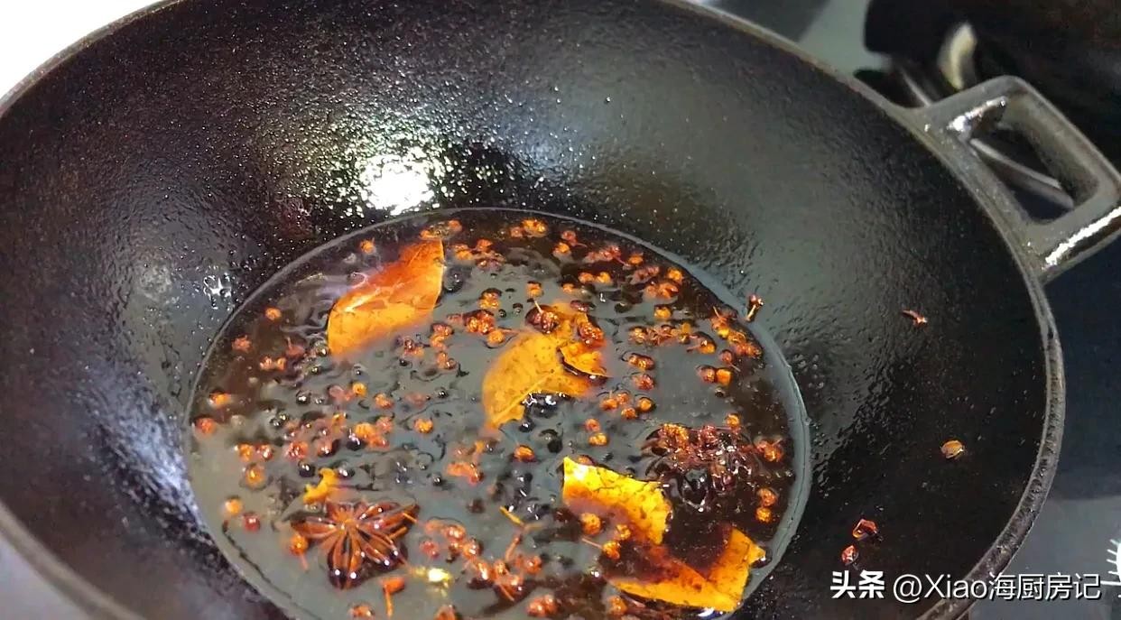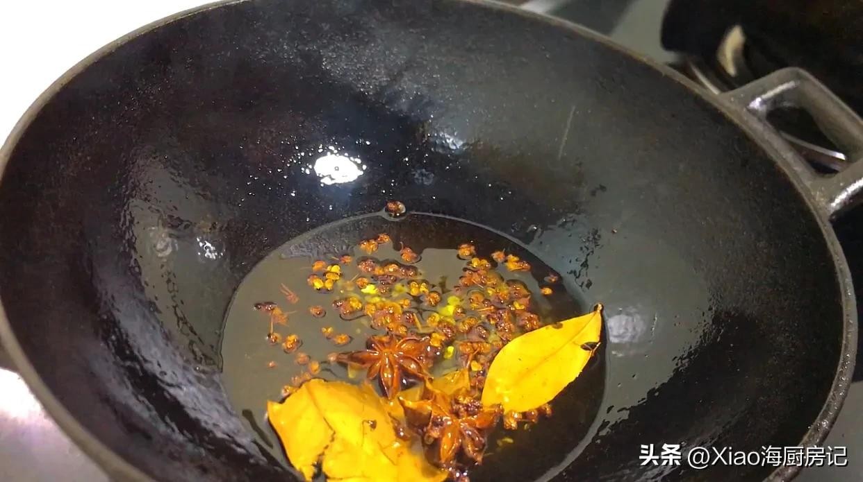 5.烧油放入花椒八角香叶冰糖小火炒出香味