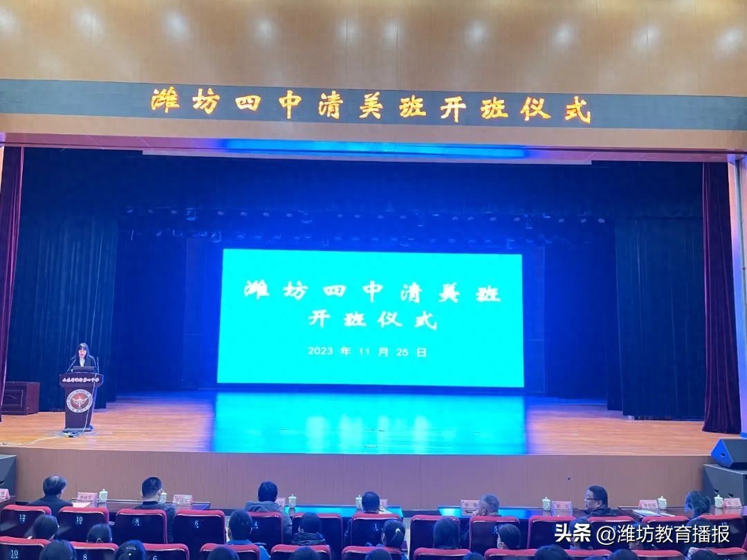 11月25日上午,潍坊四中“清美班”开班仪式在学校报告厅举行。清华美院定向培养专家马小川、姜晓东、梁民,潍坊四中党委书记、校长李汉军,坊子区教体局党组成员、基础教育研究中心主任李强出席活动。学校全体美术教师、美术专业生、部分班主任和家长代表参加活动。活动由学校艺体教学中心主任李敏主持。