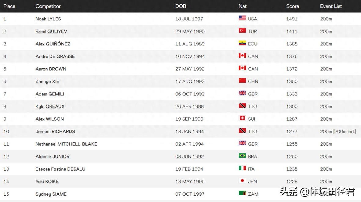 田径200米最新世界排名:谢震业第6 榜首欲破博尔特纪录