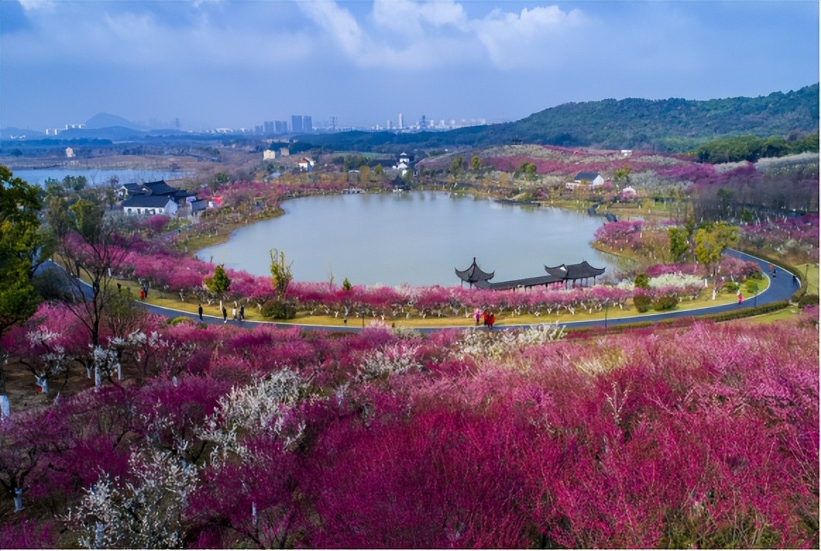 香山景区占地面积6.69平方公里,山体面积约2平方公里,海拔136.6米,为全市之冠。自古迄今,无数名人在香山留下许多足迹,不仅有西施采香留下的采香径,苏东坡亲笔题额的梅花堂,徐霞客赞叹不矣的桃花涧,也有水质如镜的香山湖、“雪海波千顷”的万株梅园以及主入口公园内占地200亩的樱花园,构成一幅湖光山色的画卷。