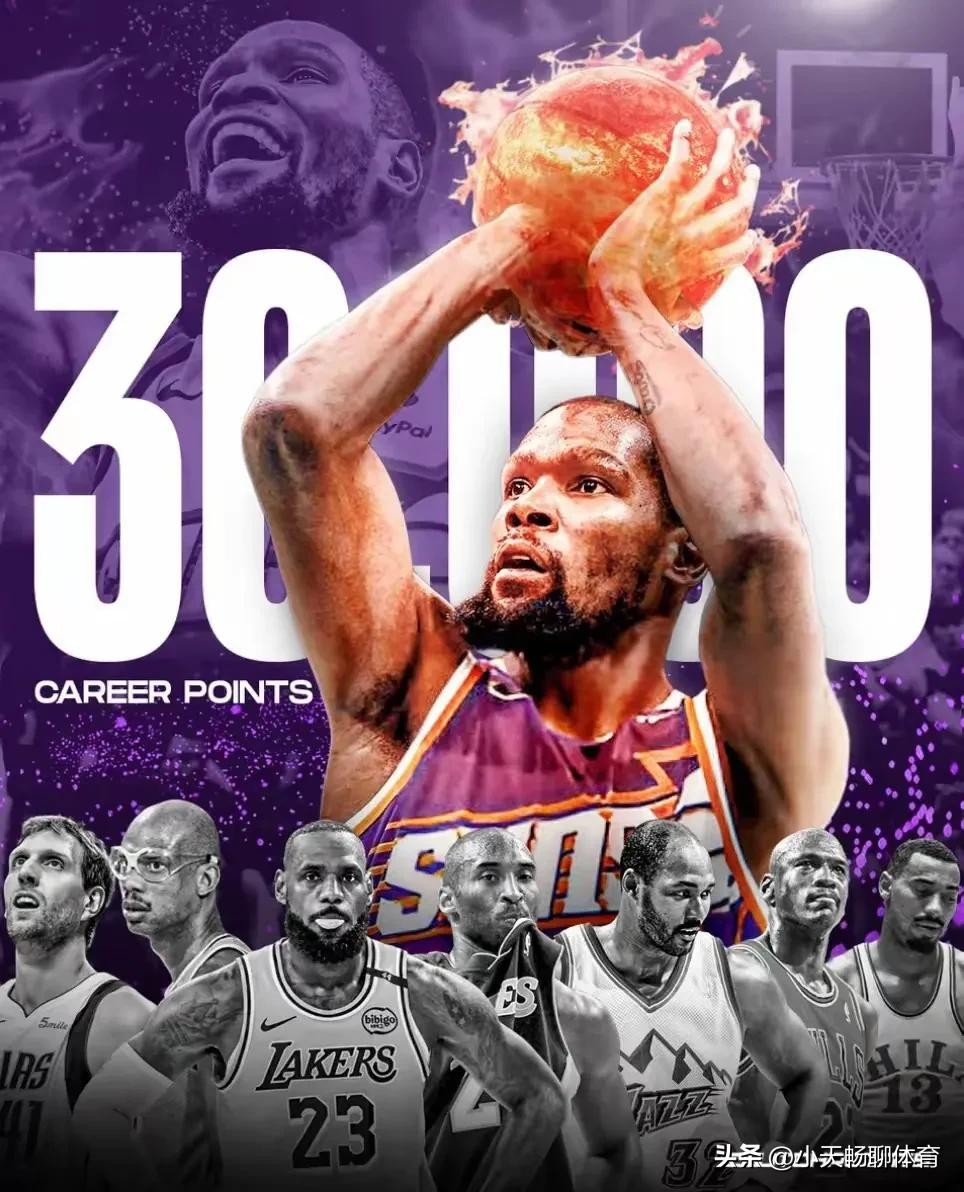 面对灰熊的比赛,杜兰特通过罚球,成功实现30000分里程碑,让其成为詹姆斯、贾巴尔、马龙、科比、乔丹、诺维斯基、张伯伦之后,联盟第八位实现3万分大关的超级巨星。
