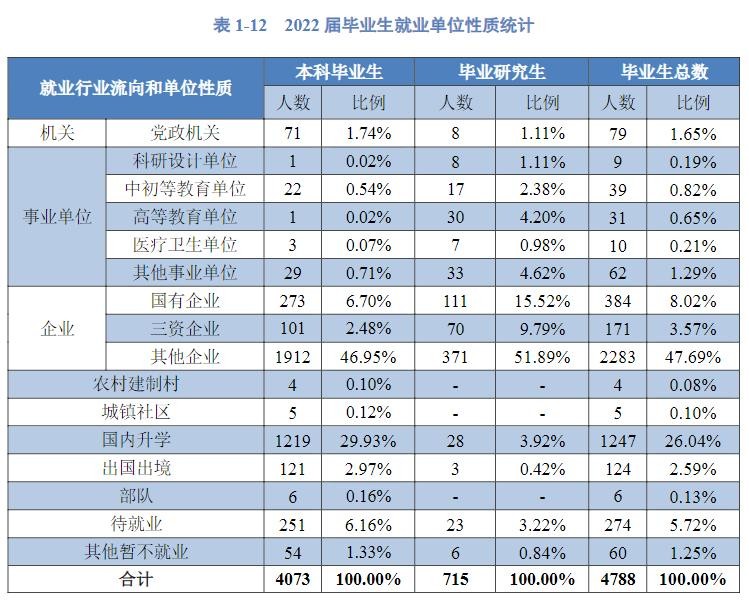 在2022届本科毕业生中2286人到企业工作,占本科毕业生总数的56.13%,本科毕业生中有1340人考取国内外研究生,国内外升学率32.90%,71人到党政机关工作,占本科毕业生总数的1.74%。