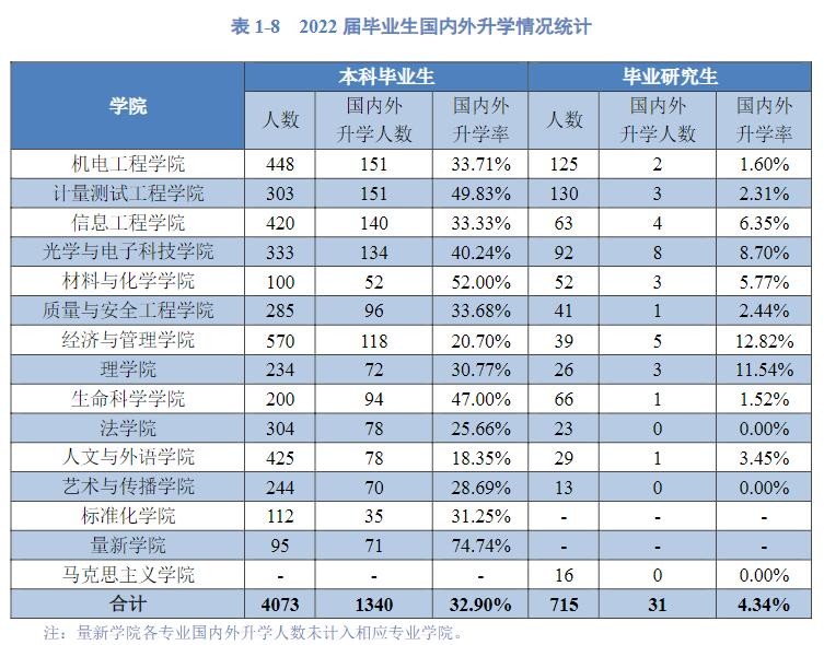 本科毕业生升学率较高的学院:量新学院74.74%、材料与化学学院52%、计量测试工程学院49.83%、生命科学学院47%、光学与电子科技学院40.24%。