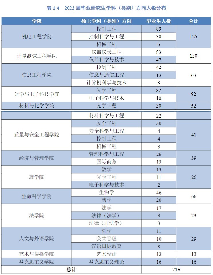 毕业硕士生人数较多的学院:计量测试工程学院130人、机电工程学院125人、光学与电子科技学院92人。