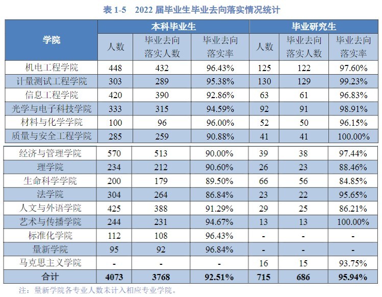 本科毕业生落实率前五的学院:量新学院96.84%、标准化学院96.43%、机电工程学院96.43%、材料与化学学院96%、计量测试工程学院95.38%。
