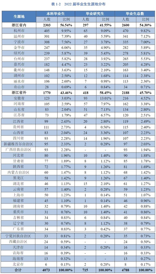 2022届毕业生来自全国31个省份,以浙江生源为主(54.3%),省外生源主要来自安徽(4.52%)、河南(3.38%)、山东(2.80%)等省份。