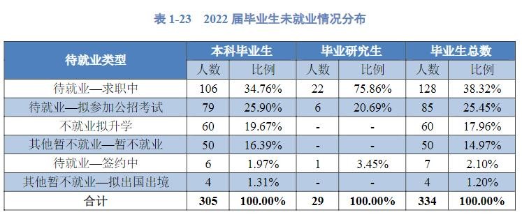 截止到2022年12月10日,全校未就业的2022届本科毕业生共305人,毕业研究生共29人。本科毕业生目前正在求职中106人(34.76%)、拟参加公招考试79人(25.9%)、不就业拟升学60人(19.67%)、暂不就业(50人)16.39%、签约中6人(1.97%)、拟出国出境4人(1.31%)。