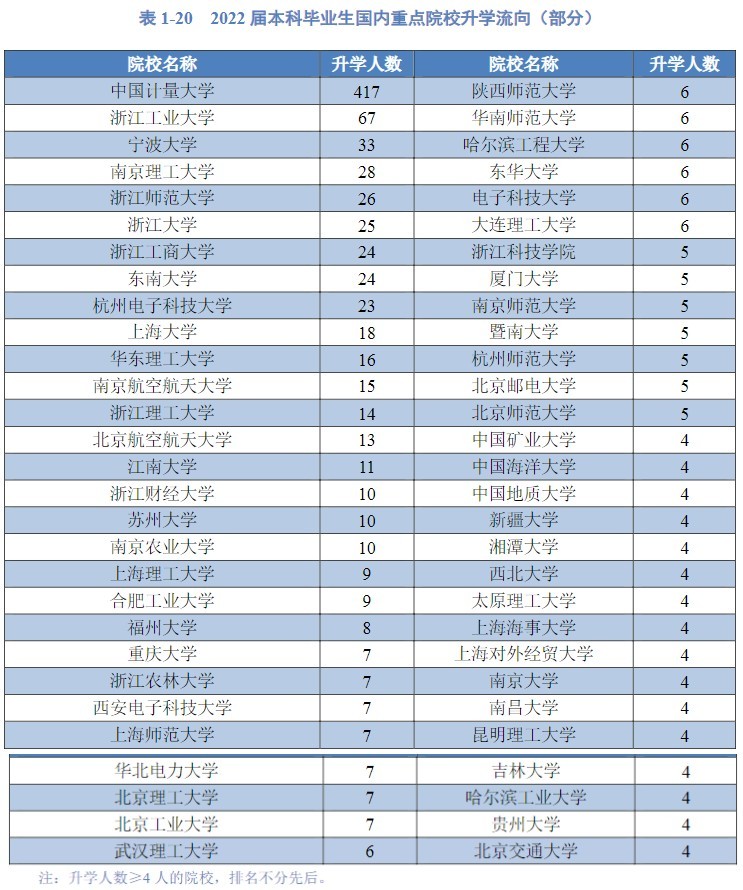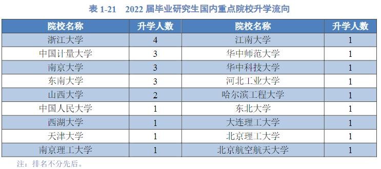 国内高校升入流向:中国计量大学417人、浙江 工业大学67人、宁波大学33人、南京理工大学28人、浙江 师范大学26人、浙江大学25人、浙江 工商大学24人、东南大学24人、杭州电子科技大学23人、上海大学18人、华东理工大学16人、南京航空航天大学15人、浙江理工大学14人、北京航空航天大学13人、江南 大学11人、浙江财经大学10人、苏州大学10人、南京农业大学10人。