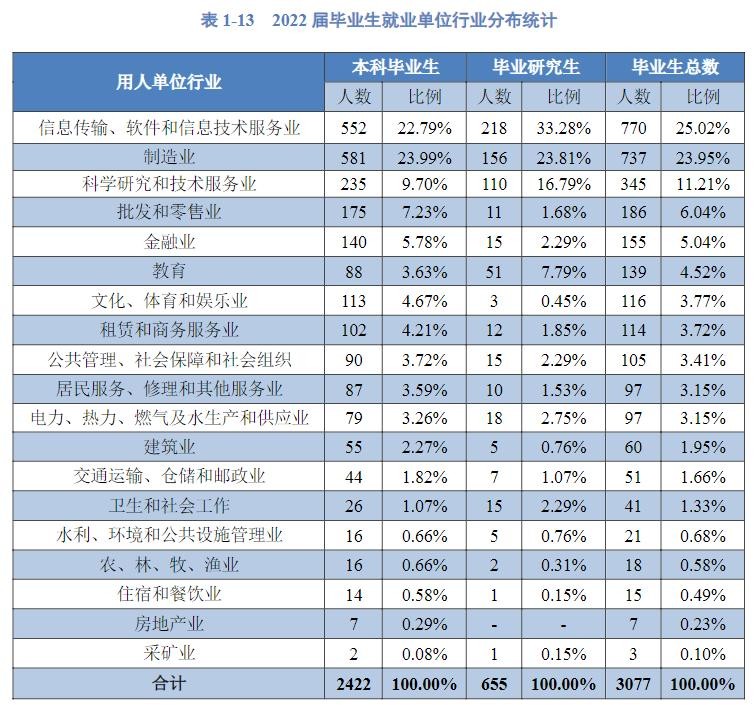 2022届本科毕业生就业流向行业前三名分别为制造业581人(23.99%),信息传输、软件和信息技术服务业552人(22.79%),科学研究和技术服务业235人(9.70%)。