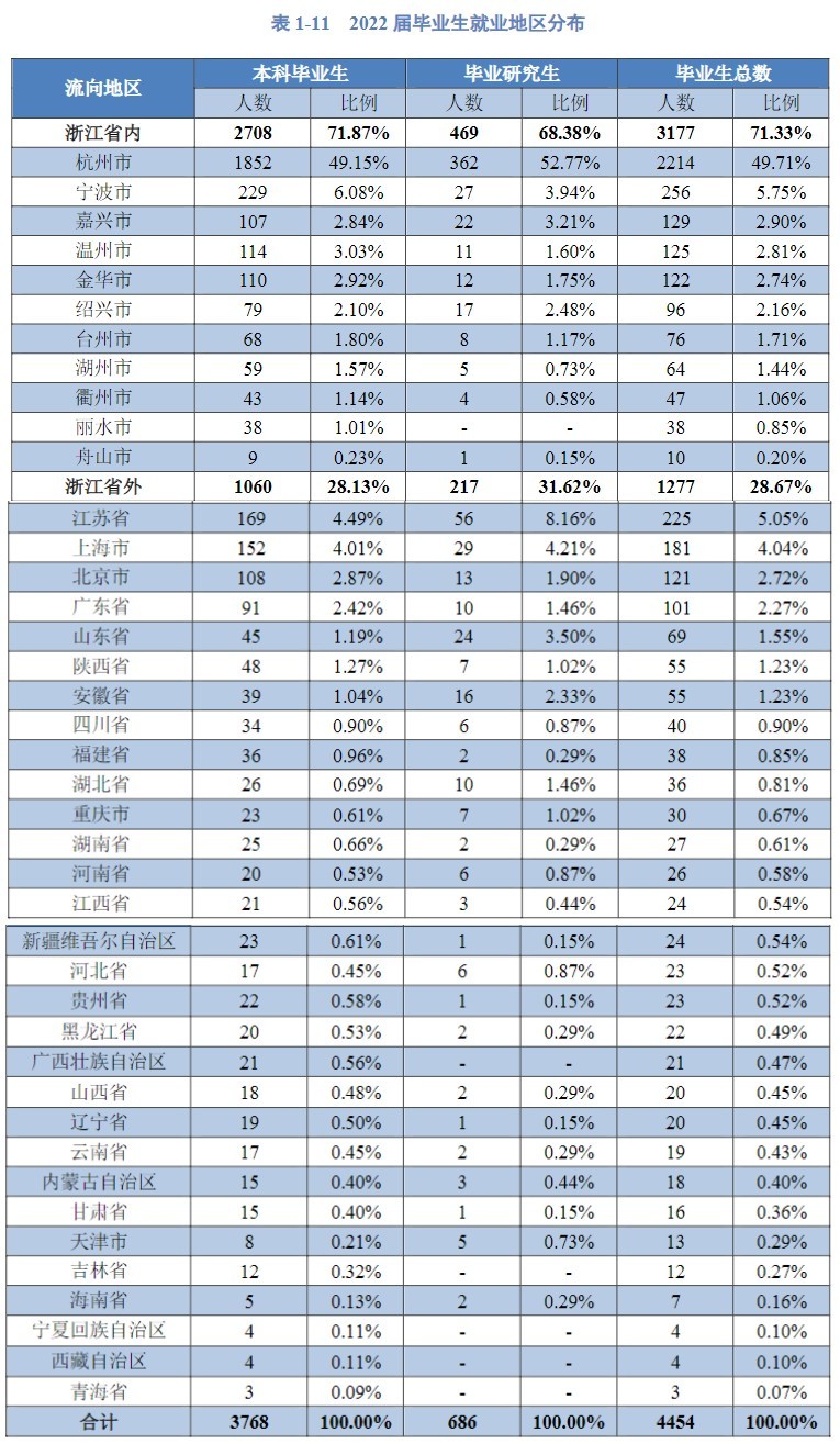 2022届本科毕业生在浙江省内(2708人)就业占比71.87%,省外主要流向江苏省4.49%、上海市4.01%、北京市2.87%、广东省2.42%。