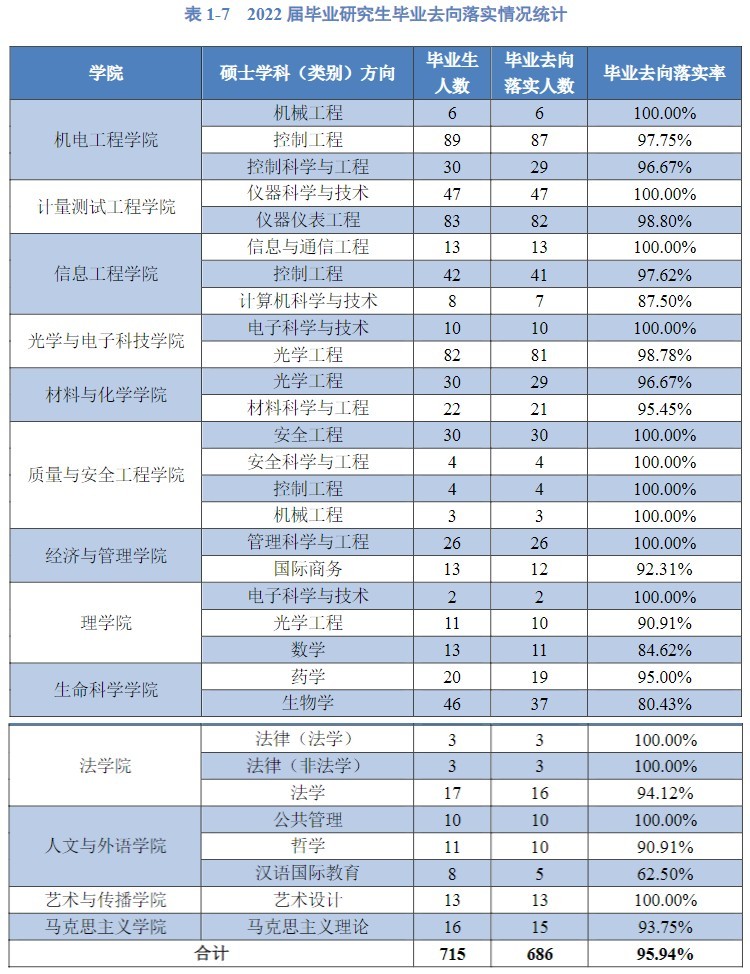 研究生落实率靠前的学院:质量与安全工程学院100%、艺术与传播学院100%、计量测试工程学院99.23%。