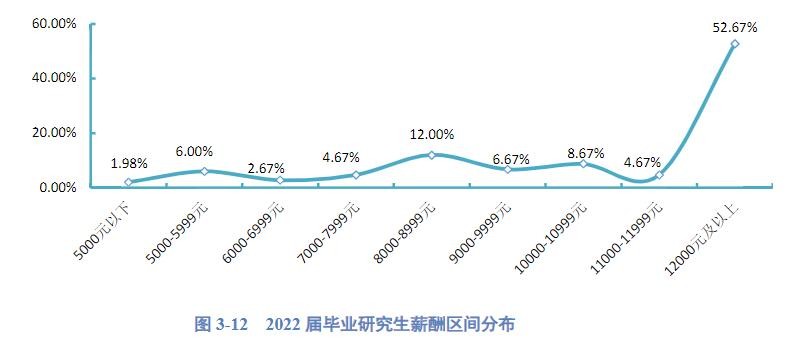 2022届毕业研究生月均收入主要集中在12000元及以上区间内,其中12000元及以上区间占比52.67%,8000-8999元区间占比12.00%。