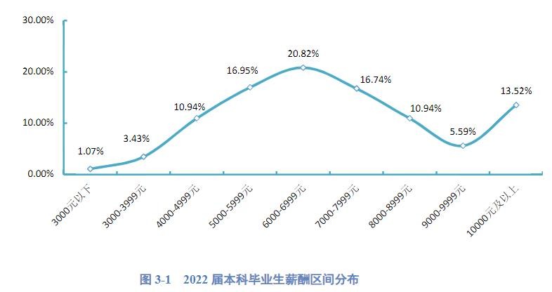 2022届本科毕业生月均收入主要集中在6000-6999元区间内,其中6000-6999元区间占比20.82%,5000-5999元区间占比16.95%,7000-7999元区间占比16.74%。