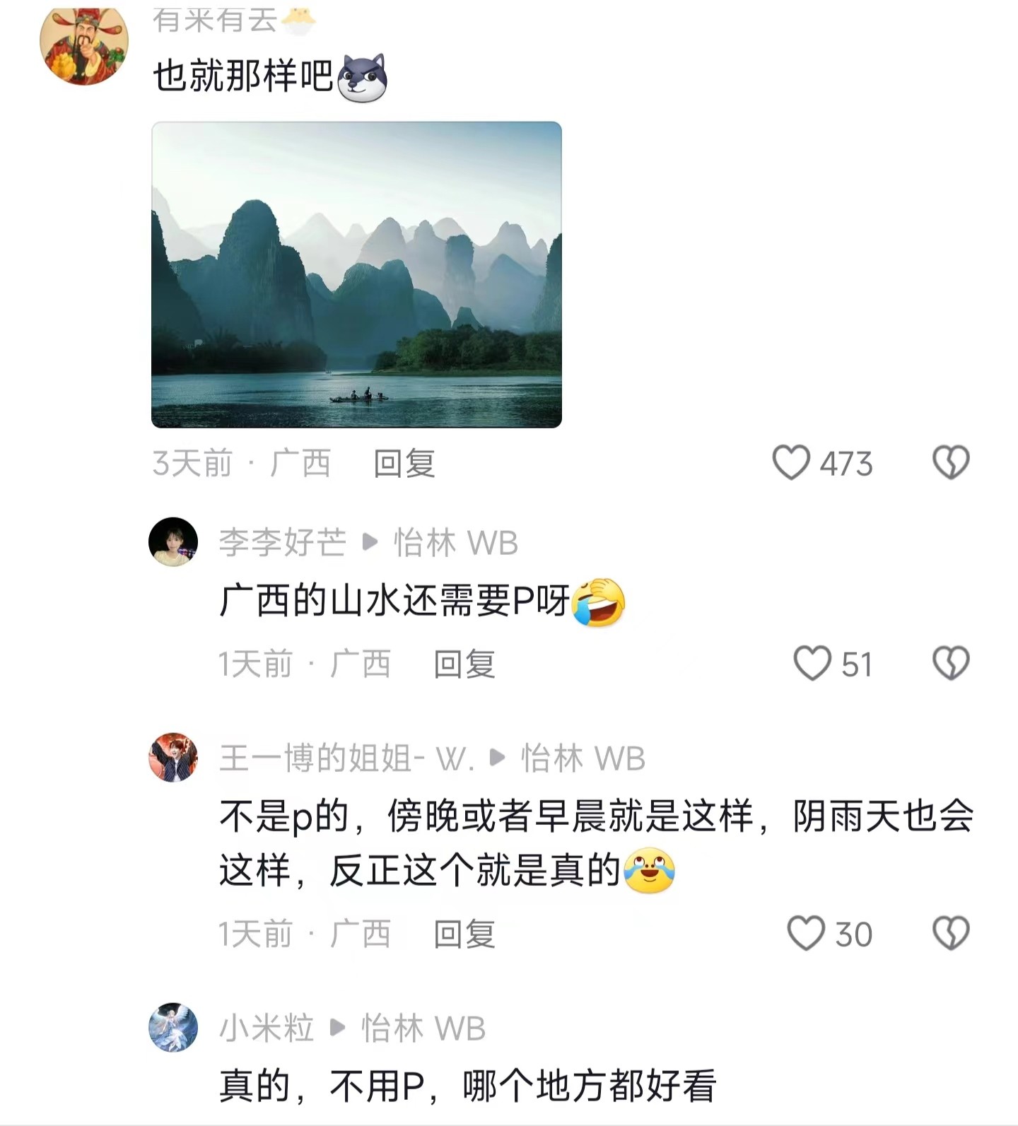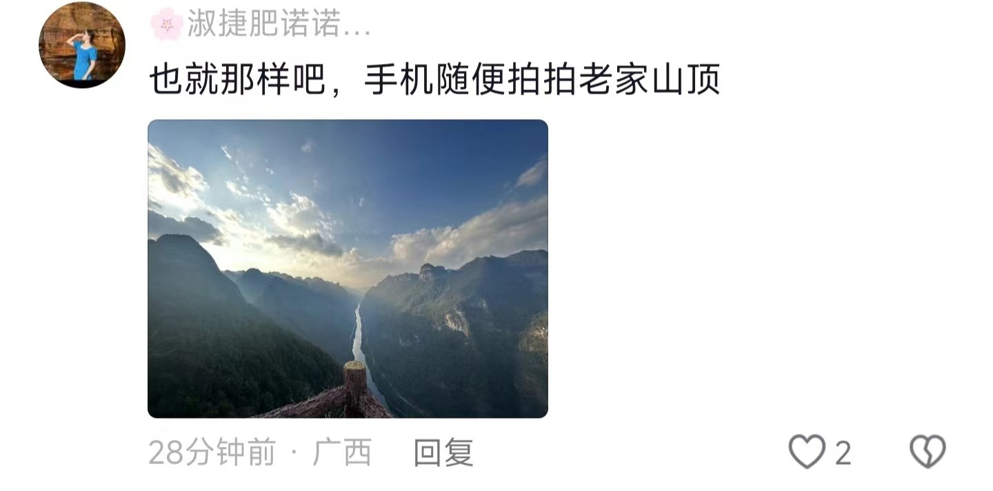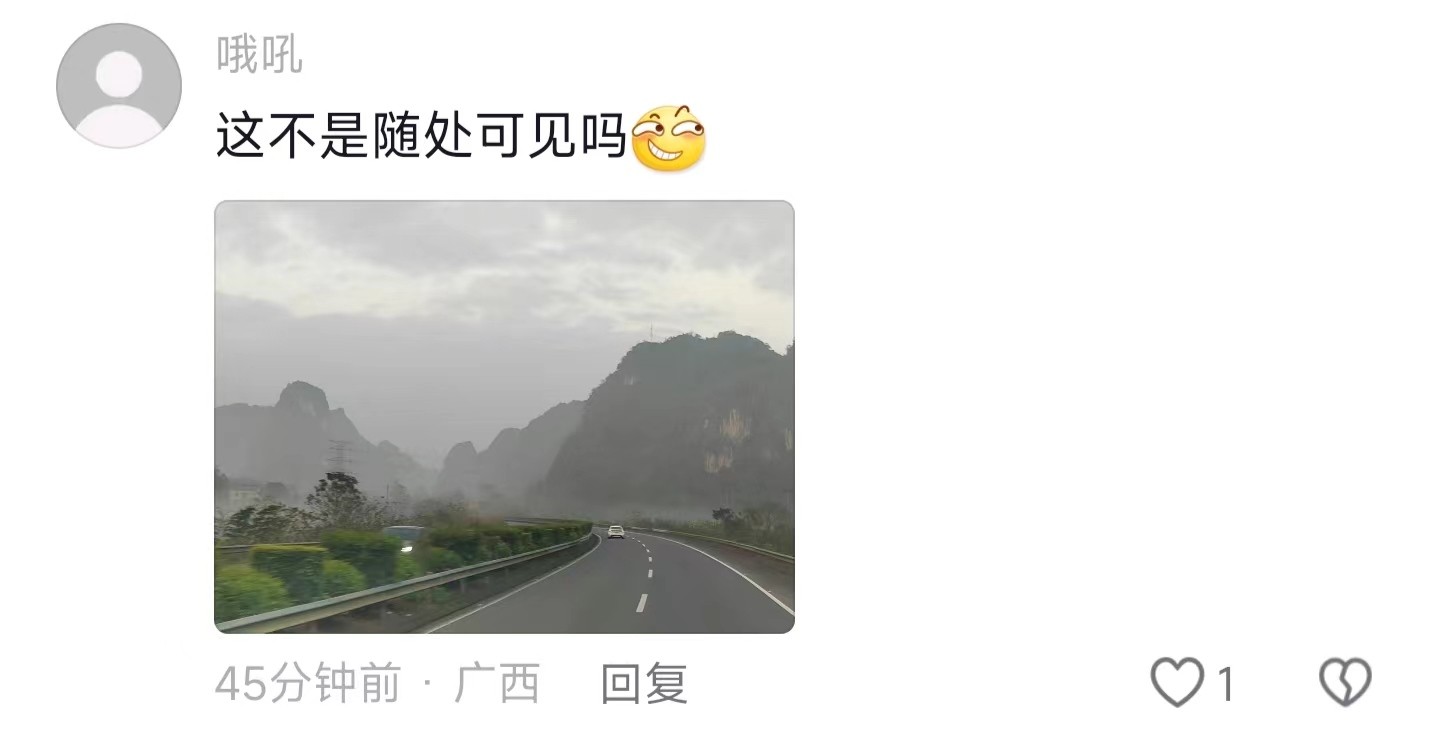 对广西人来说,这样的风景太平常了,因为他们每天都能看到,一睁开眼都是山包包,所以看见这样的风景也不会觉得很惊讶。如果让广西人去看一望无垠的大草原、冰川雪山这些,他们也会感到很震惊,“地球上怎么会有如此壮丽的风景”。