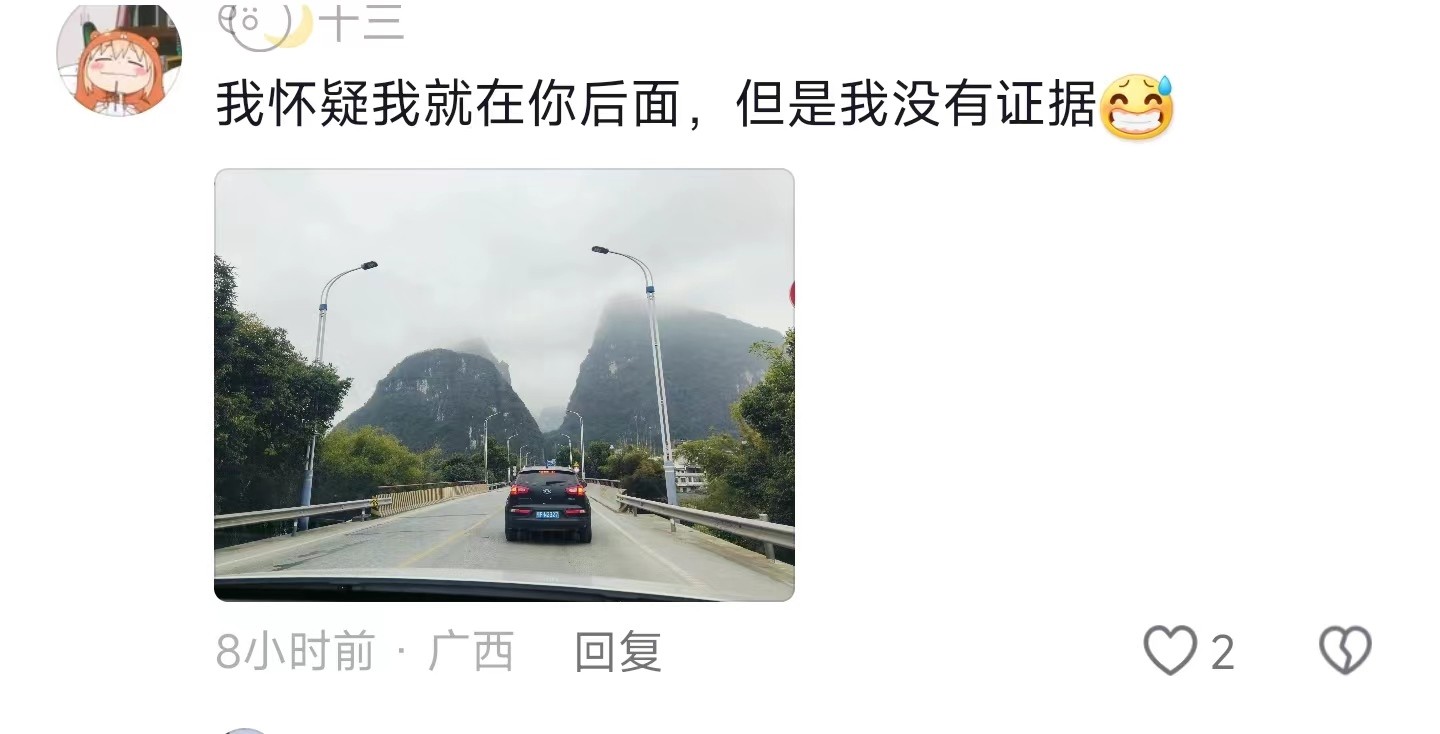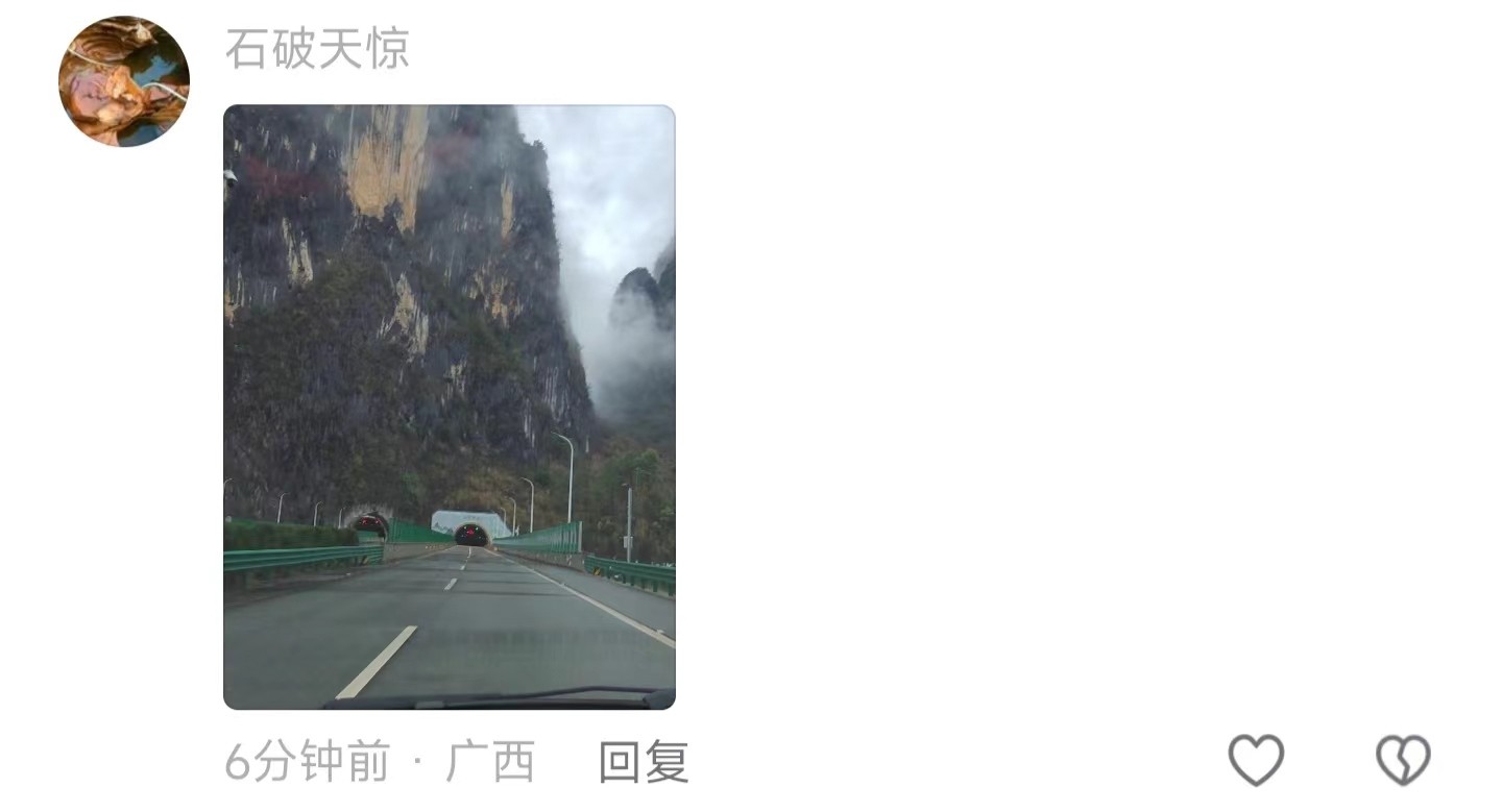 “梧柳高速过来北帝山那段也很美,我一个广西人都迷糊了。”路上的风景很好,但也不要分心驾驶哦。