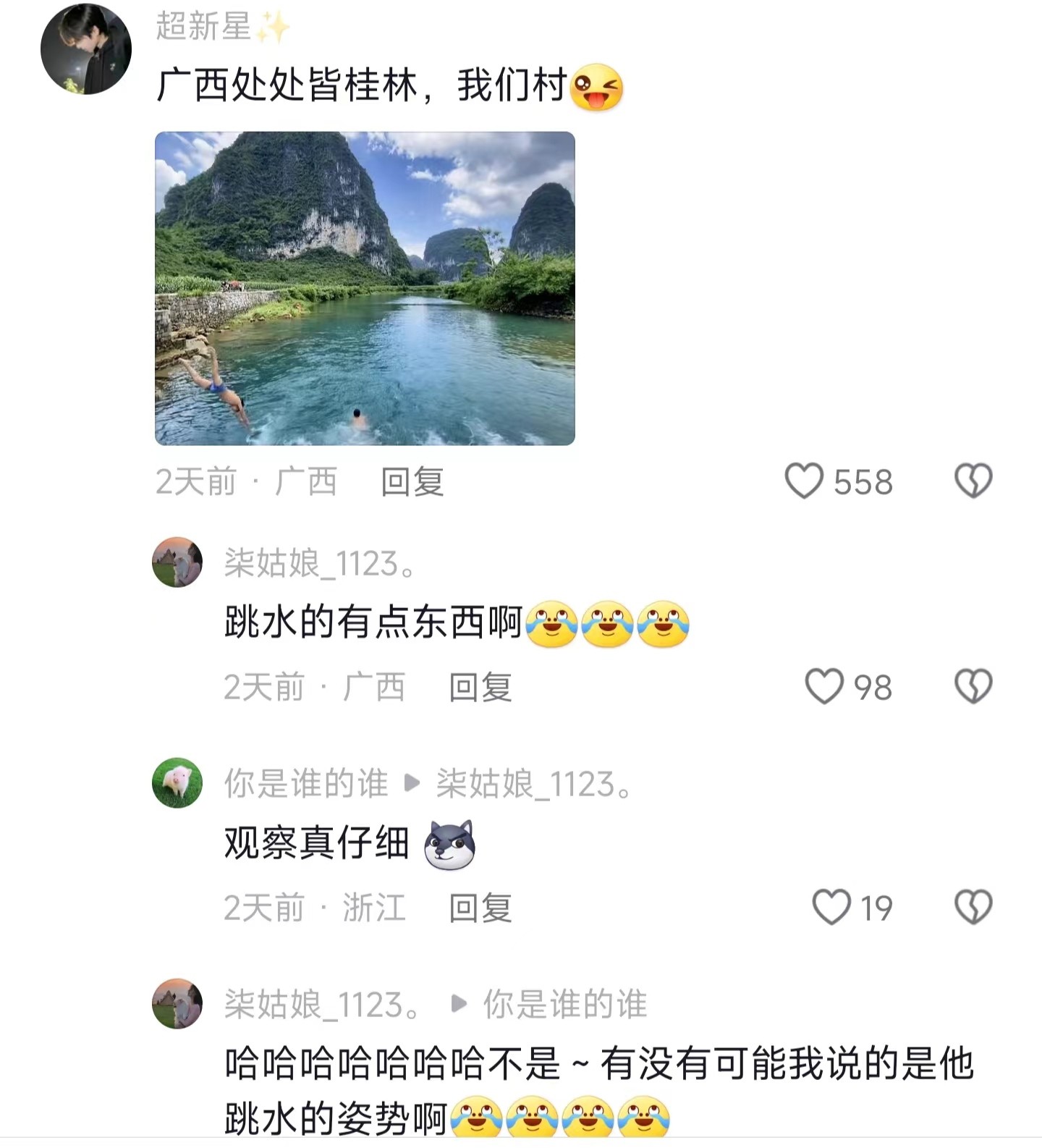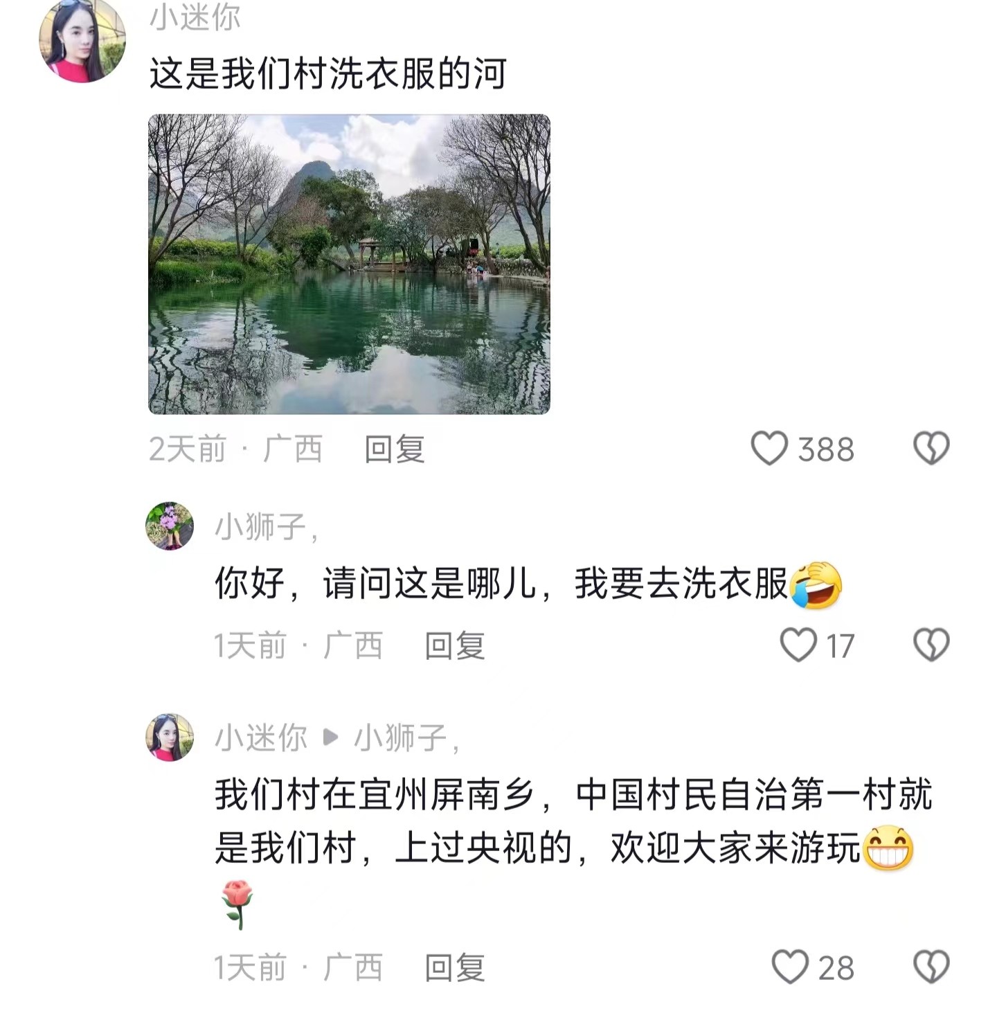 很多广西的网友也纷纷晒出自己随手一拍的照片,有些是故乡的,有些是放牛的,有些用来洗衣服的……