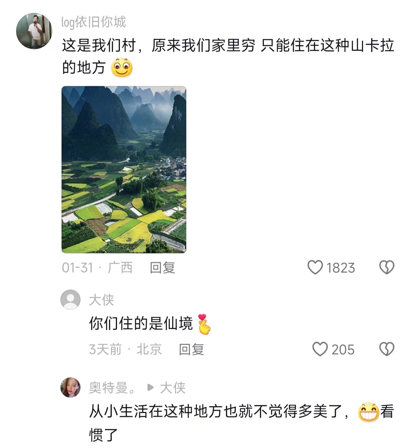 是啊,从小生活的地方,都已经审美疲劳了,自己看见的就感觉很普通,但对别人来说就是世外桃源,是仙境,是向往的田园生活。