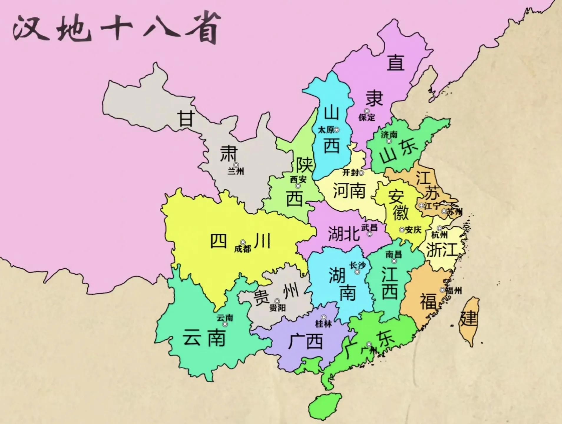 “汉地十八省”是满清康熙在位时期确定的行政划分,一直延续到清末。