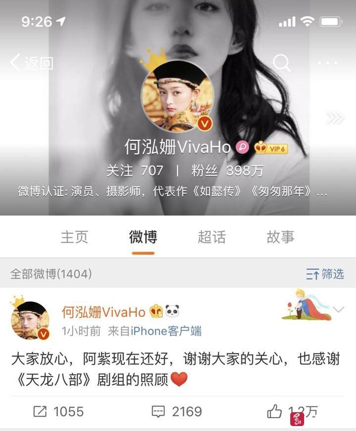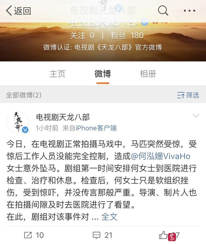 演员何泓姗拍新版《天龙八部》意外坠马 微博报平安:阿紫还好