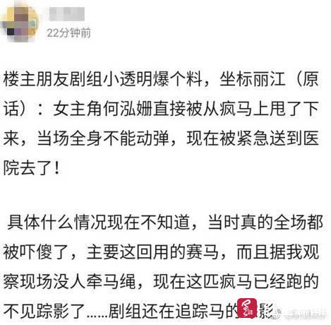 据悉,何泓姗在丽江拍新版《天龙八部》,有消息称,何泓姗骑的马是赛马,当时无人牵马绳,目前这匹马跑得没了影儿,剧组方还在追踪马的踪迹。疑似何泓姗经纪人朋友圈发文:“多事之秋,God Bless U…”