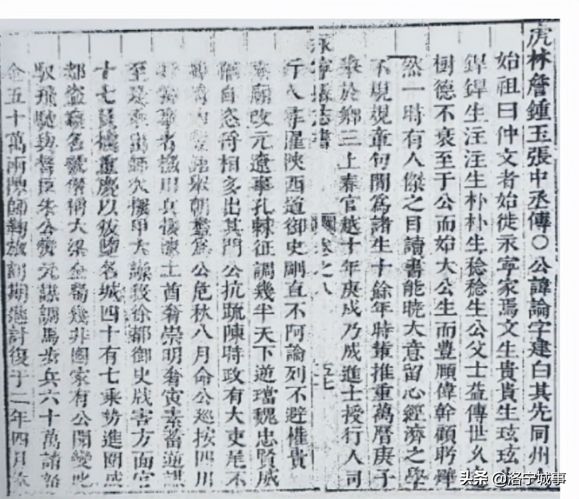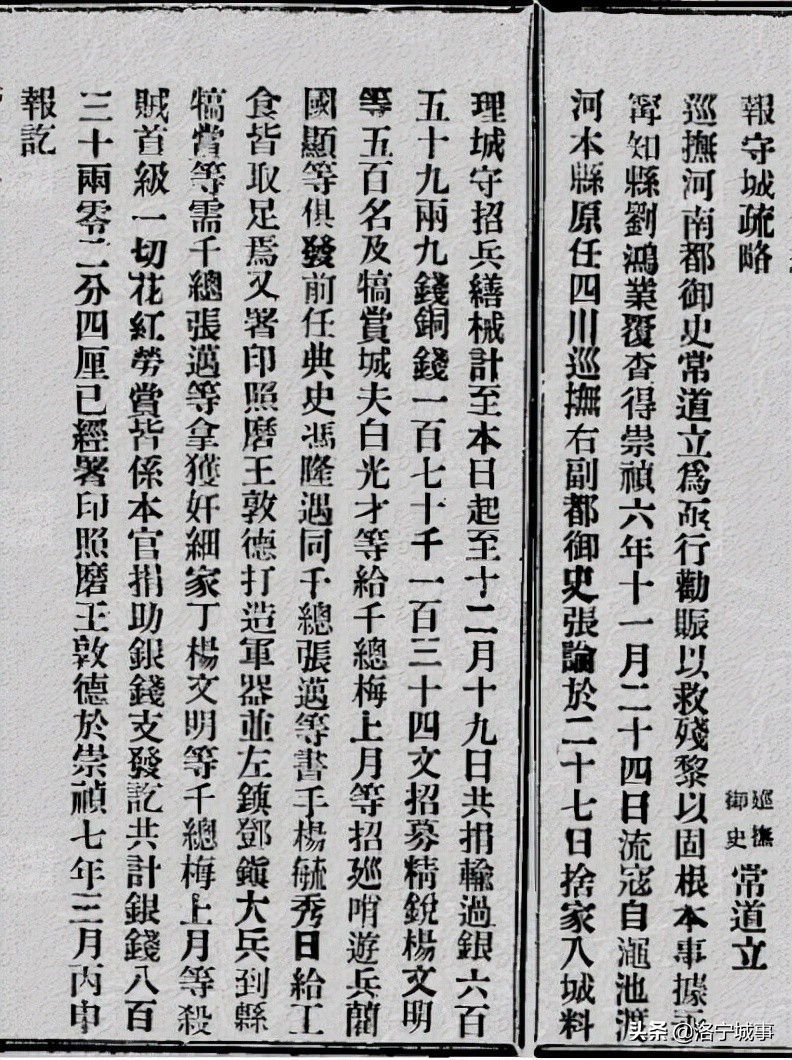 三月,河南巡抚、都御史常道立《报守城疏略》:“巡抚河南都御史常道立为亟行劝赈、以救残黎、以固根本事。据永宁知县刘鸿业覆查得,崇祯六年十一月二十四日流寇自渑池渡河,本县原任四川巡抚右副都御史张论于二十七日舍家入城料理城守,招兵缮械,计至本日起至十二月十九日共捐输过银六百五十九两九钱,铜钱一百七十千一百三十四文,招募精锐杨文明等五百名,及犒赏城夫白光才等,给千总梅上月等,招巡哨游兵蔺国显等俱发,前任典史冯隆遇同千总张迈等,书手杨毓秀日给工食皆取足焉。又署印照磨王敦德打造军器,并左镇、邓镇大兵到县犒赏等需,千总张迈等拏获奸细家丁杨文明等,千总梅上月等杀贼首级,一切花红劳赏皆系本官捐助银钱支发,讫共计银钱八百三十两零二分四厘,已经署印照磨王敦德于崇祯七年三月内申报讫。”