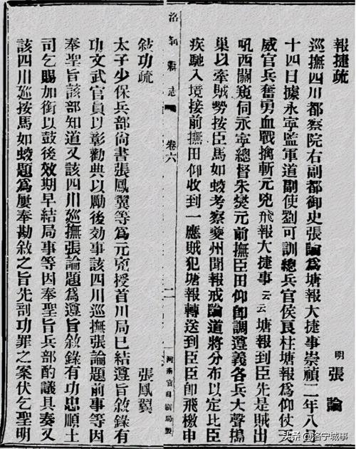 六月,兵部尚书王在晋向崇祯皇帝上《叙功疏》,尊旨确查四川平叛有功人员。该疏云:“六月兵部尚书王在晋等为遵旨确查川功,分别叙录,以凭圣裁事。四川先年解围、复城、捣巢,有功官员,稽案既久,委宜查叙,以彰激劝。......如解围、复城,则御史张论所勘也。......外监御史张论矢心戮力,料理决奇,驱驰瘴雾蛮烟,折冲千里,迅扫长蛇封豕,底定三川。查本官特奉监督征进之命,懋著开疆拓土之功,拮据二年,始终三案,劳不亚于总督,赏应优以世。及至于布政等官周著等八员,俱三案有名,定为上等。......崇祯元年六月初四日具题。三十日奉圣旨览奏。四川解围、复城、捣巢三案,内外文武有功官员,查覈既确,自应优叙,以示激劝。张论加二级,服阕遇督抚缺推用,荫一子锦衣卫指挥同知世袭,赏银四十两,紵丝三表裹,各给与应得诰命云云,该部知道钦此。