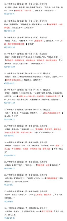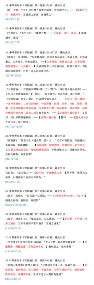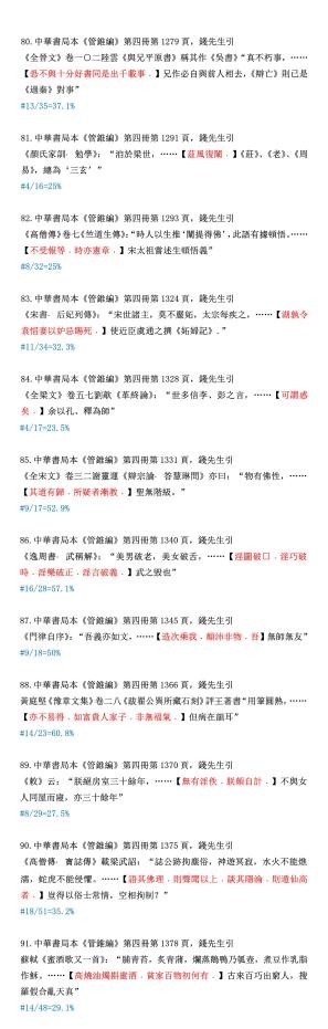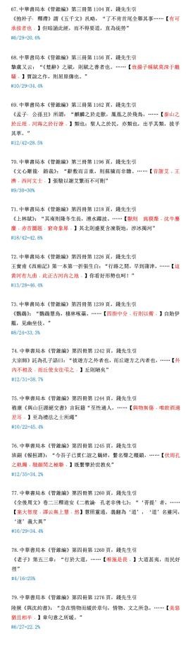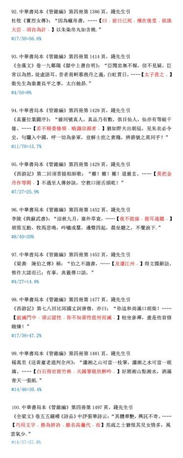下边我们为读者随机录出100条例证,原样提供给读者选读。当然还须举出被删文字做参考。就是说读此材料,必须先认明以下凡例:“……”为中华本《管锥编》正文。其位置为编辑使用该符号的具体地方,下面的“【】”内为被删节的全部文字(本系统使用红色),原引文标点保持;再下面“#”单行,则为删除的字数和原有字数的比例。所有字数计算,不包括标点。读书不遵凡例,是不妥当的。违反了凡例的批评者,我不便答复,因那是不平等的对话。