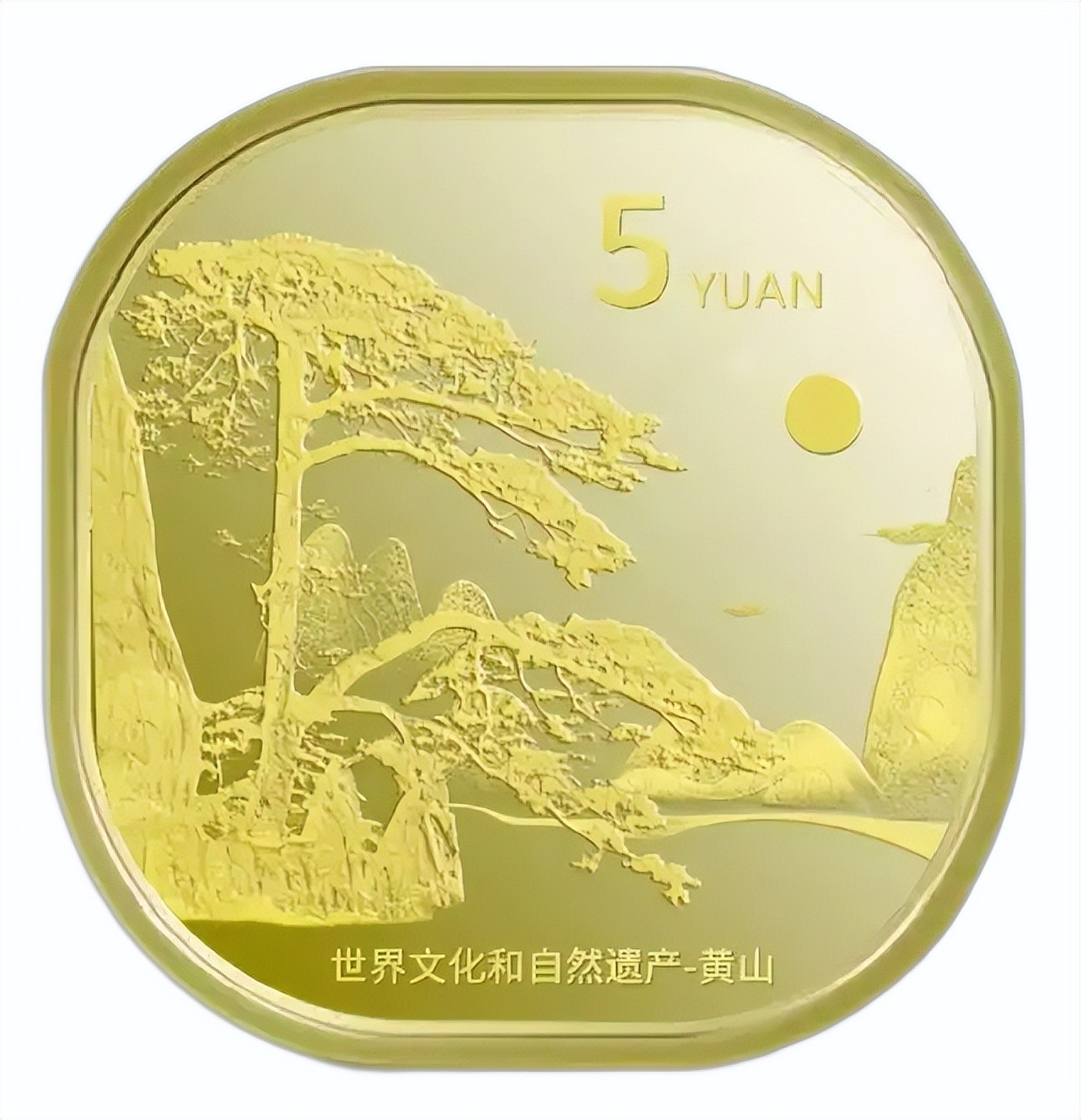 今年的黄山币、峨眉山币,面值5元、圆角方形形制、黄铜合金材质、1.2亿枚。