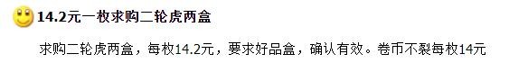 今日大宗市场虎币求购价已经跌至14-14.2元/枚;