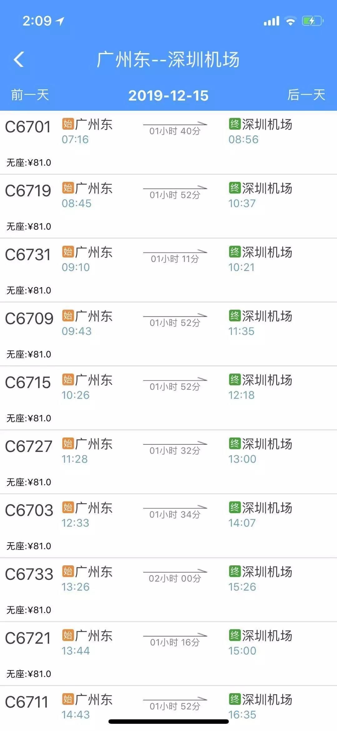广州东至深圳机场,无座全程售价为81元。