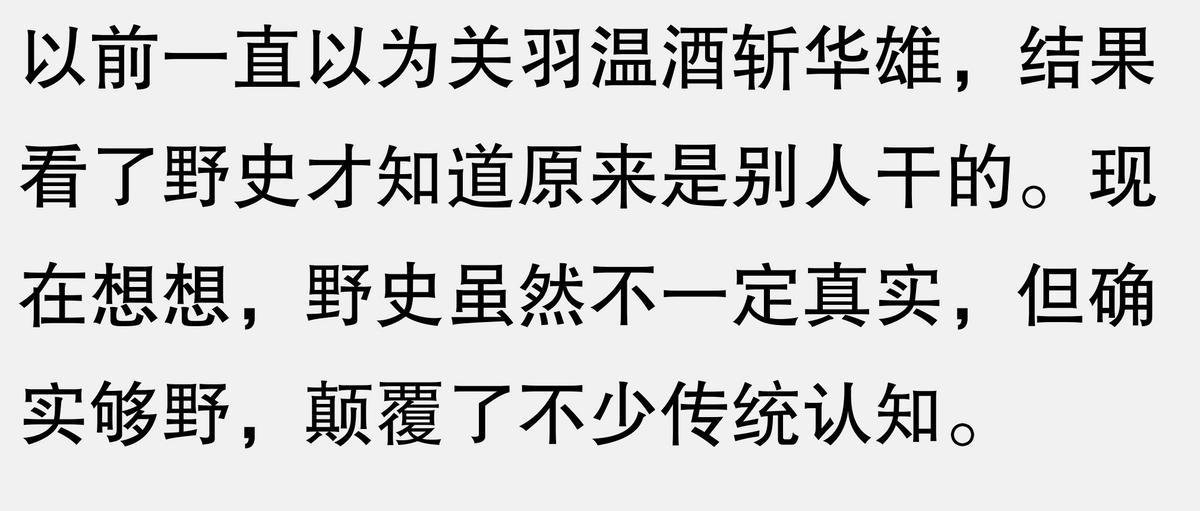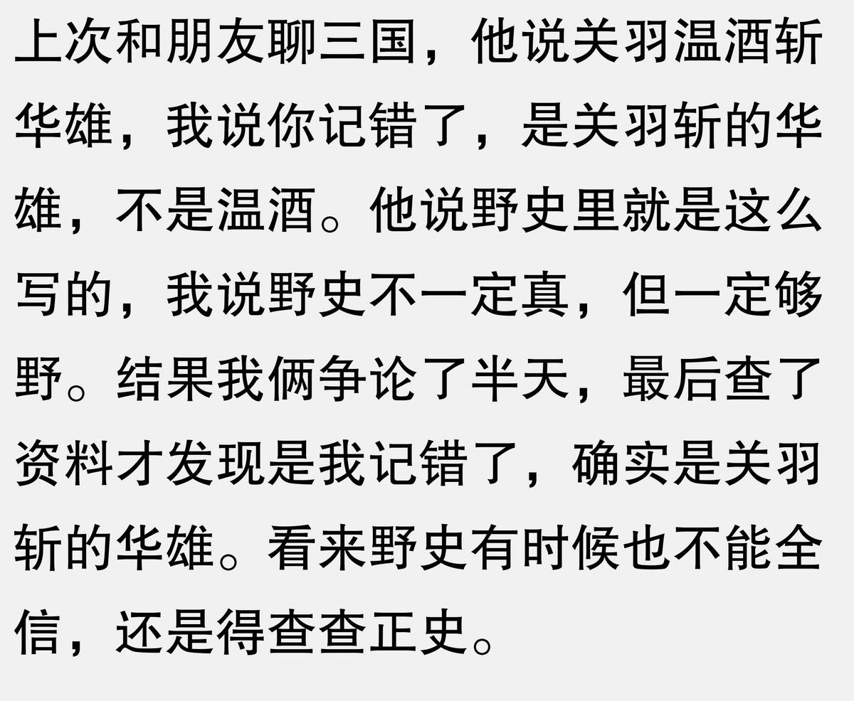 昨天和朋友讨论三国演义,朋友说关羽温酒斩华雄,我立刻纠正他是华雄斩的关羽。我们争论了半天,最后查了资料才发现我们两个都记错了,其实是曹操斩的华雄。看来野史确实够野,连正史都能被传得面目全非。