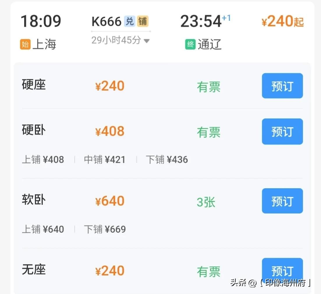 29小时上海直达通辽?K666次快车沿途经停27站,硬座票仅需240元