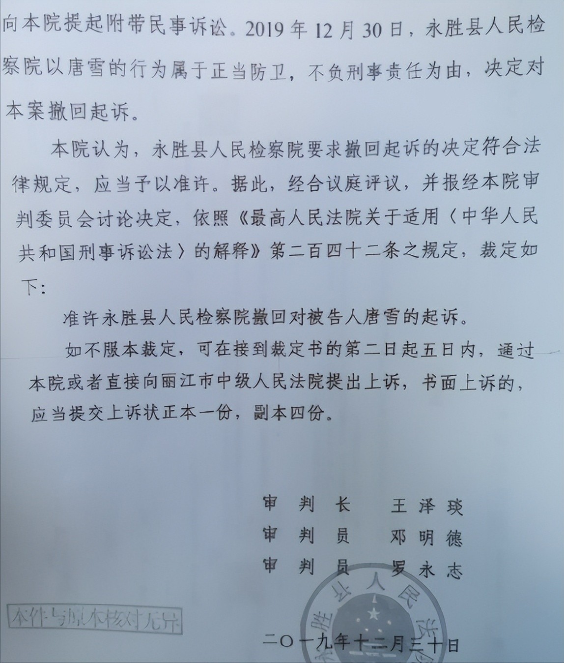 永胜县检查院对其第一次淡定是判定唐雪故意伤害罪,因为唐雪当时手持刀具冲锋伤人,而当时的李德湘手中已经没有了任何可以对唐雪造成实质性伤害的武器,在这个角度下,法院最终才会有了故意伤人这样的判定。