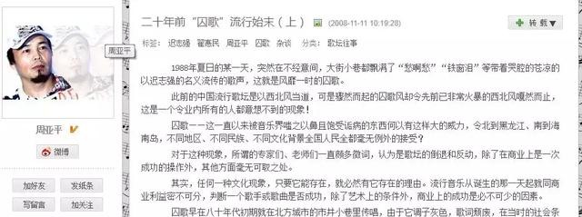 2008年,周亚平在自己的微博中发表了《二十年前“囚歌”流行始末》。