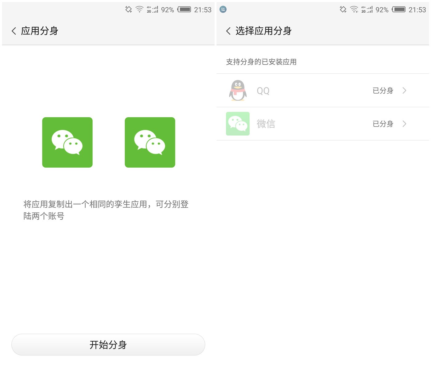 此外还有应用分身,这个功能的好处自不必说了。过年抢双份红包,或者是自己开个小号和最亲近的朋友玩朋友圈,都是现在极易被忽略的“刚性需求”。