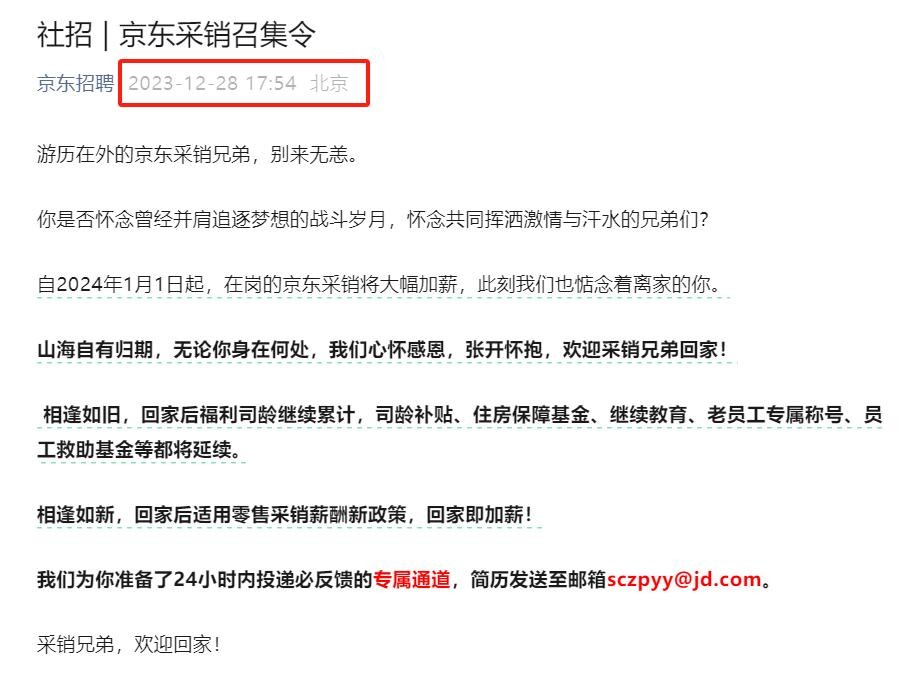 2023年12月28日,京东官宣:“采销兄弟,欢迎回家”。