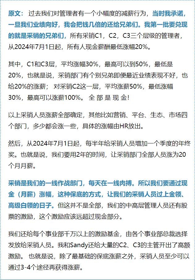 关于他提到的“采销部门去年加工资”,应该是指2023年12月27日京东官方宣布的:自2024年1月1日起,京东采销等一线业务人员的年固定薪酬大幅上涨近100%,2024年初京东零售全员将平均加薪不低于20%。