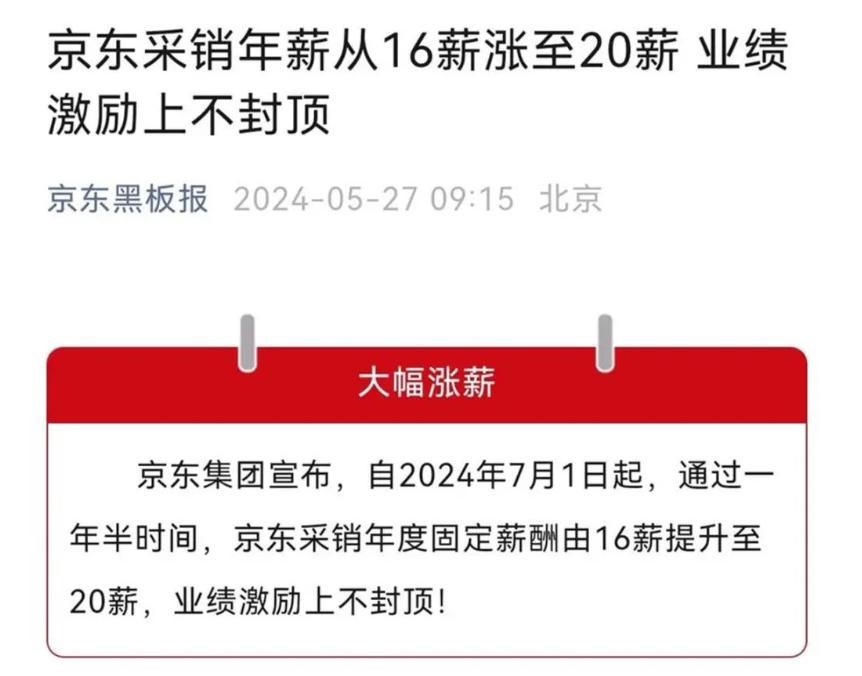 2023年12月27日,京东官宣:自2024年1月1日起,京东采销等一线业务人员的年固定薪酬大幅上涨近100%,采销部门管理层降薪10%-20%。