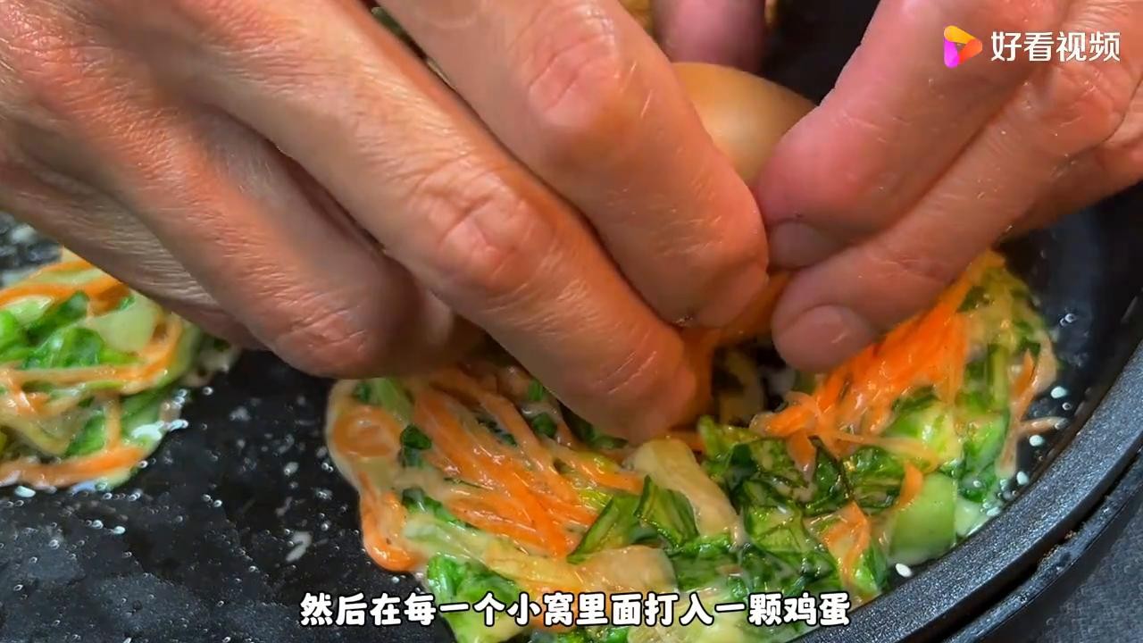 ·在每一个小窝里面打入一颗鸡蛋,上面再撒上一点黑芝麻,既可以增香而且比较好看。