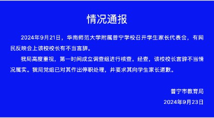 9月23日晚,普宁市教育局通报:9月21日,华南师范大学附属普宁学校召开学生家长代表会,有网民反映会上该校校长有不当言辞。我局高度重视,第一时间成立调查组进行核查。经查,该校校长言辞不当情况属实。我局党组已对其作出停职处理,并要求其向学生家长道歉。