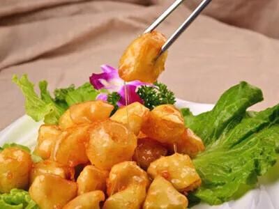 (5)、糖色至金黄色出丝时,倒入炸好的香蕉,撒上芝麻翻匀快速出锅装盘,外带冷水沾涮食。