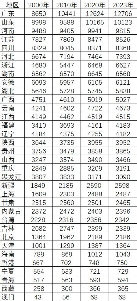 2023年末,我国总人口14.4亿,34个省市区中广东、山东2省人口超过1亿。广东常住人口在2006年开始居全国首位,2023年人口为1.27亿。河南、江苏、四川、河北、浙江、湖南、安徽、湖北和广西等9个省区人口超过5000万。这11个省区中,只有湖南省2023年人口比2010年减少了2万人,其他10个省区人口均有增长。