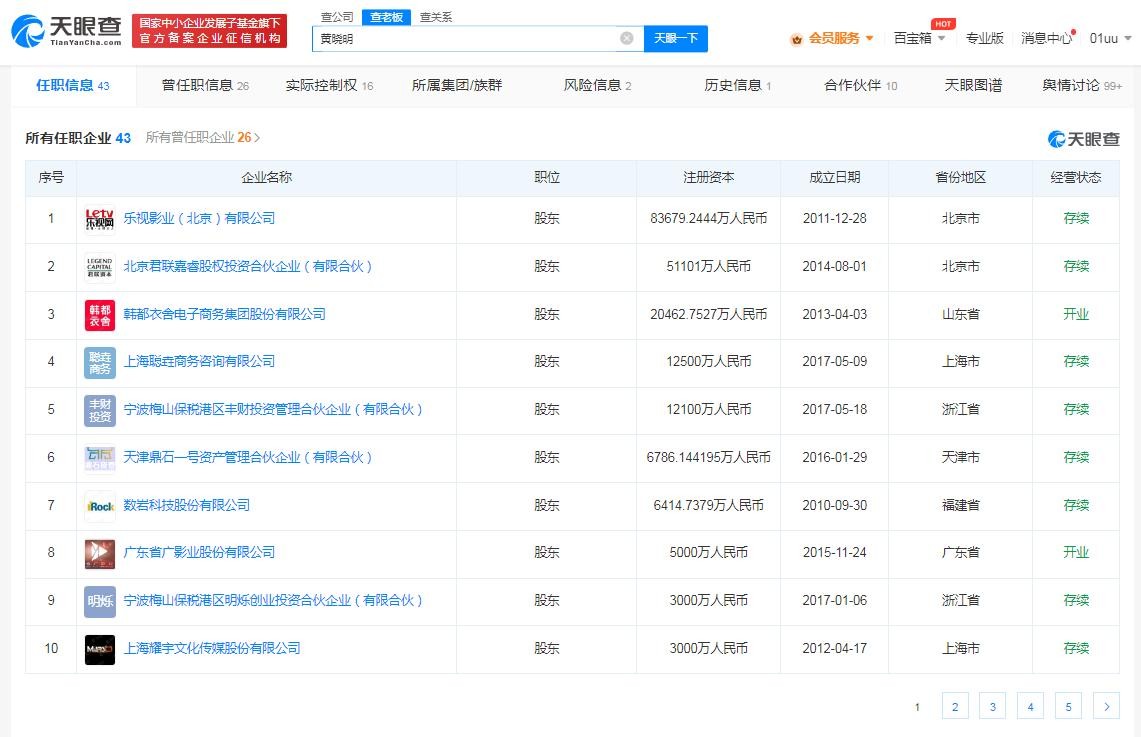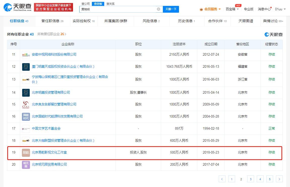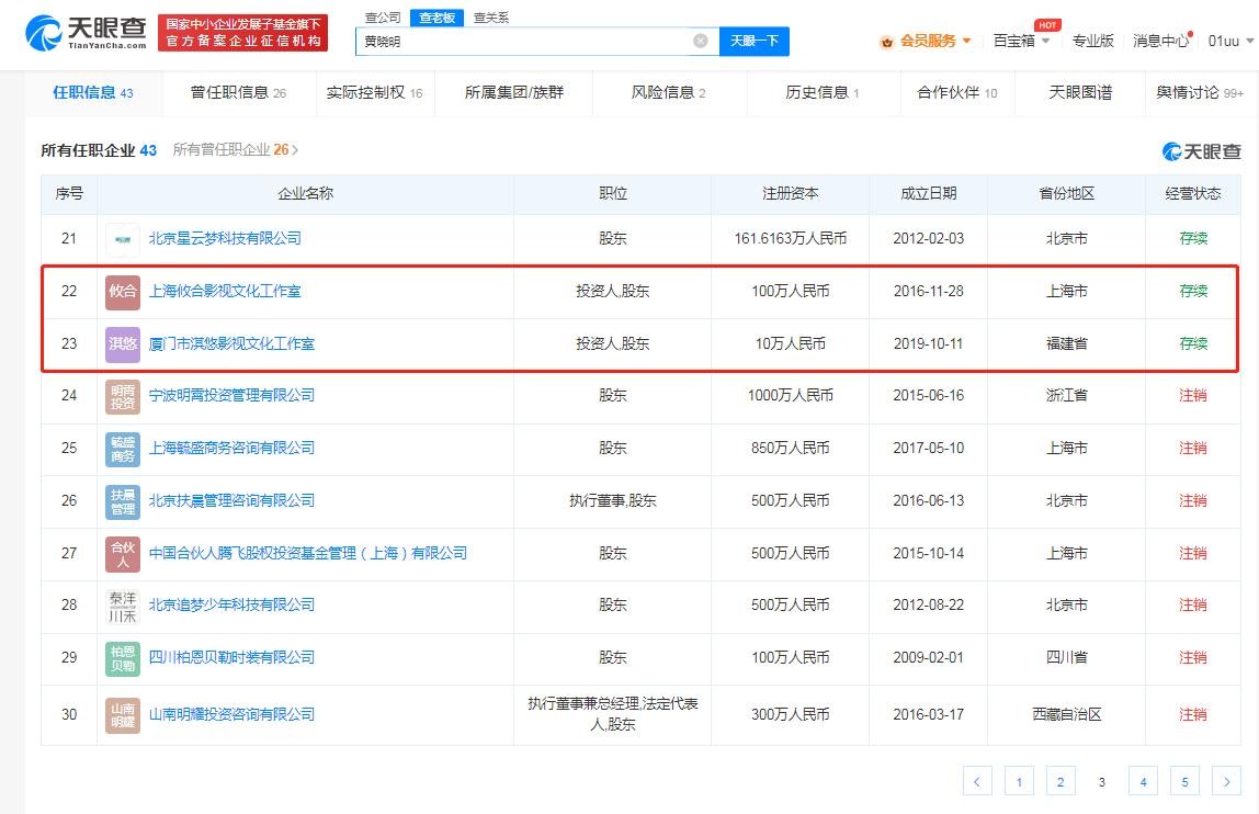 目前,黄晓明关联的企业中有20余家为存续状态,其中包含北京易乾影视文化工作室、上海攸合影视文化工作室、厦门市淇悠影视文化工作室3家个人工作室。