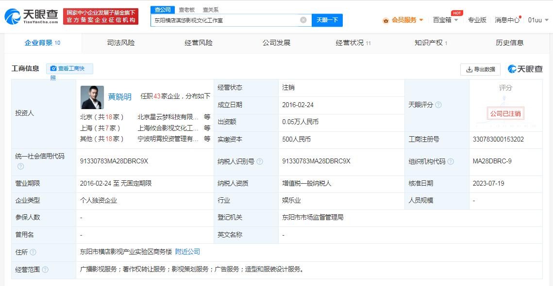 黄晓明横店影视工作室注销!