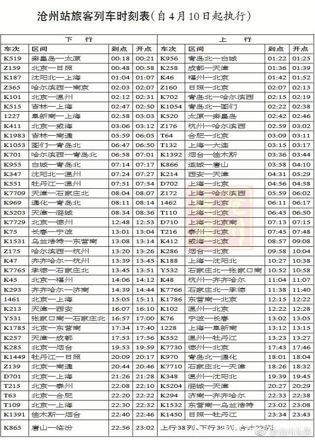 4月10日起沧州站实行新列车运行图,列车时刻表来了,请收藏