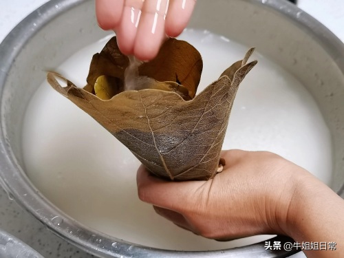 5、手掌打开,两个大叶子对头放,然后搭上大小合适的粽叶,中间放一个完整漂亮的,抓上两把米。