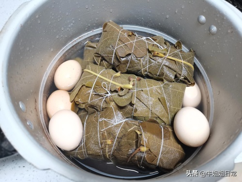 7、高压锅内的粽子不要超过安全线,加入水,基本没过粽子,然后插空放入6个鸡蛋。