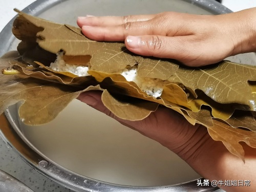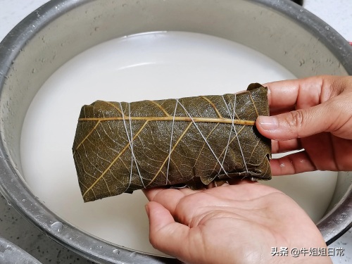 6、如图,一头卷起来,用手从另一头往里兜水,两头卷起来,用线绑扎成捆。大约跟手掌一样长,一样宽,大小适合放进高压锅里。