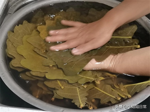 3、搓洗粽叶:盆内加满水,把煮过的粽叶放入,如图,正面对搓,边搓边洗,全部搓完后,用清水冲两遍。